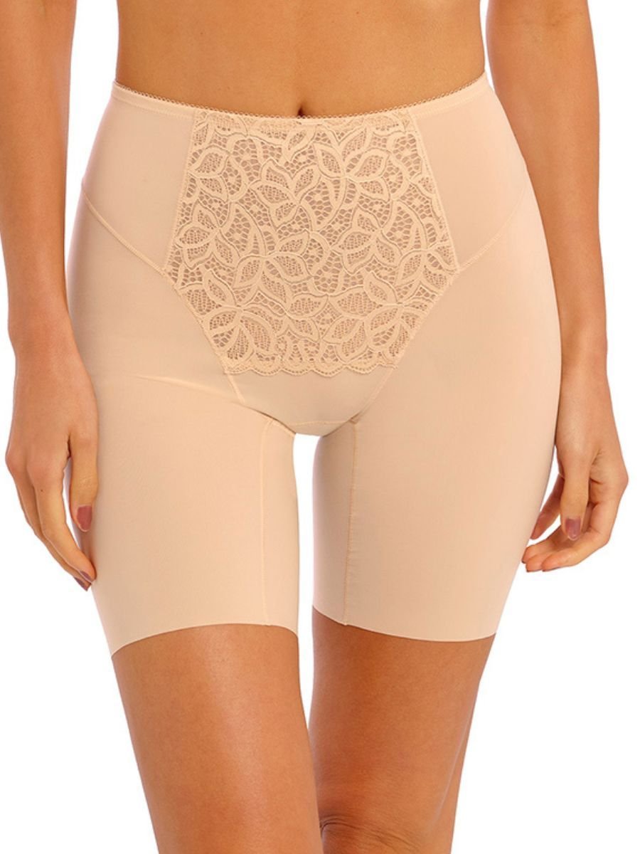 Luxurious Nude Raffine Long Leg Shaper by Wacoal designed to enhance natural curves. Features a stretch lace front panel lined with powermesh for tummy control and an elasticated waistband for a snug fit.