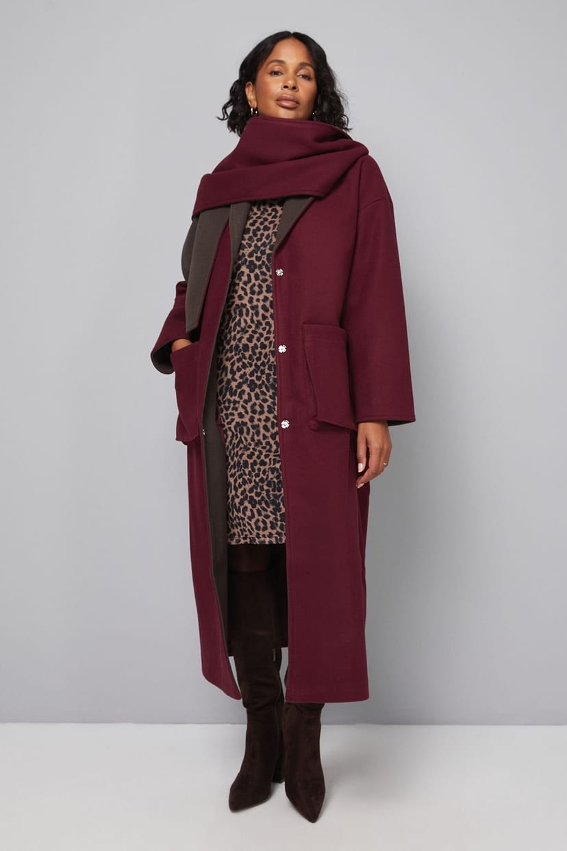 The Wallis Berry Double Faced Scarf Detail Coat is available in sizes 12, 14, 18.