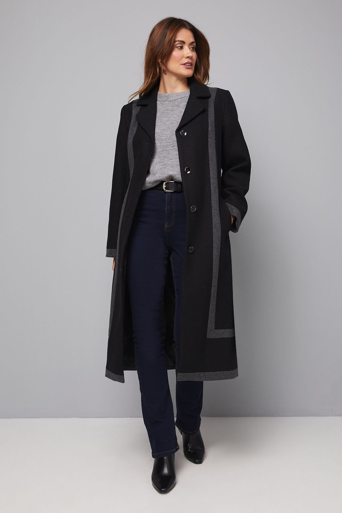 The Wallis Black Contrast Detail Belted Coat is ideal for casual, work, evening.