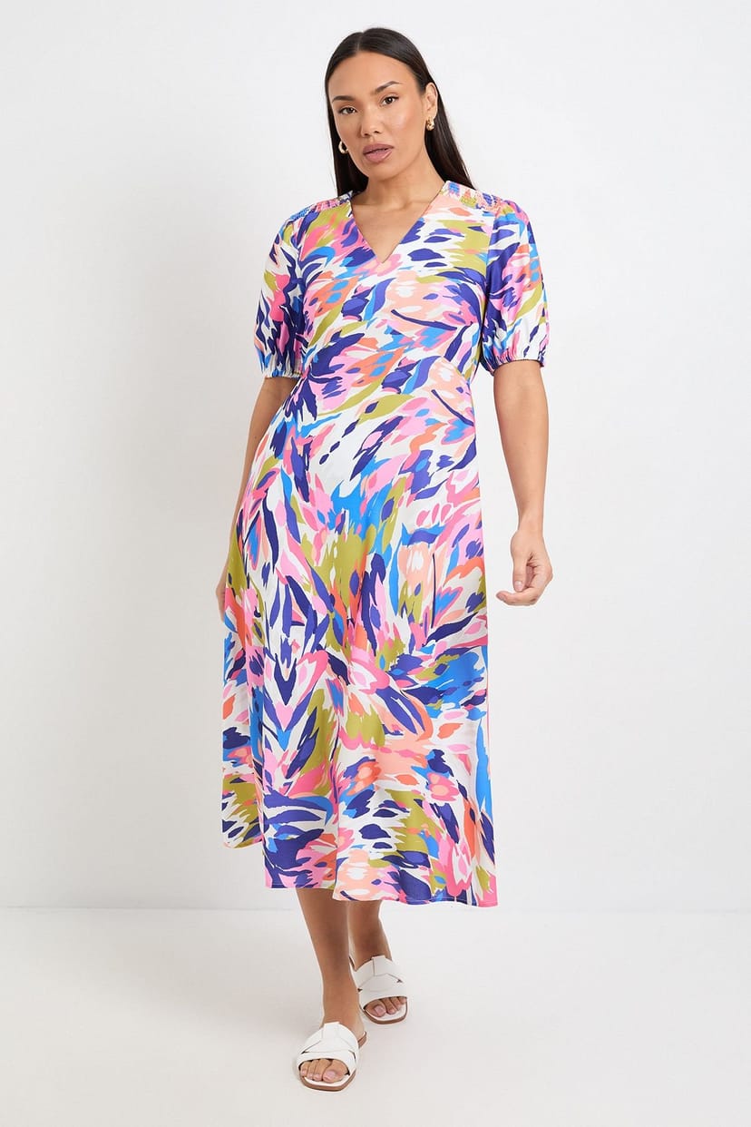 This Wallis midi dress features a vibrant abstract print in shades of pink, blue, and green. The ruched detailing adds a flattering silhouette, perfect for a casual yet stylish look.
