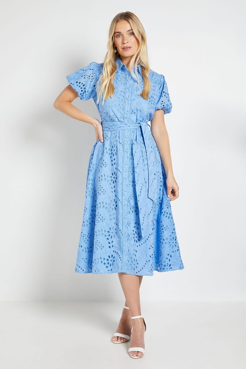 Charming blue broderie anglaise midi dress with a classic collared neckline and button-down front. The flattering tie waist and short puff sleeves add a feminine touch, perfect for daytime wear.
