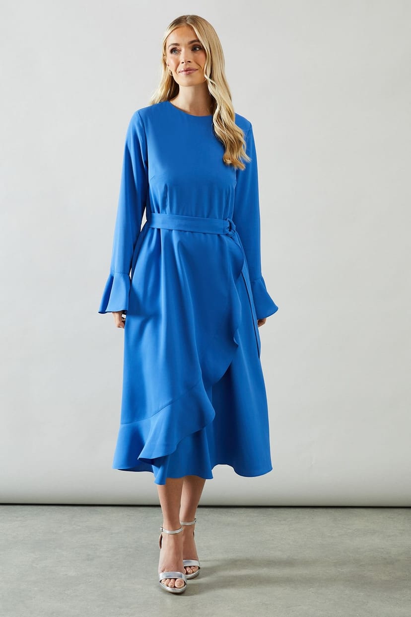 The Wallis Blue Twill Midi Dress with Ruffle Front is ideal for evening, date-night, party.