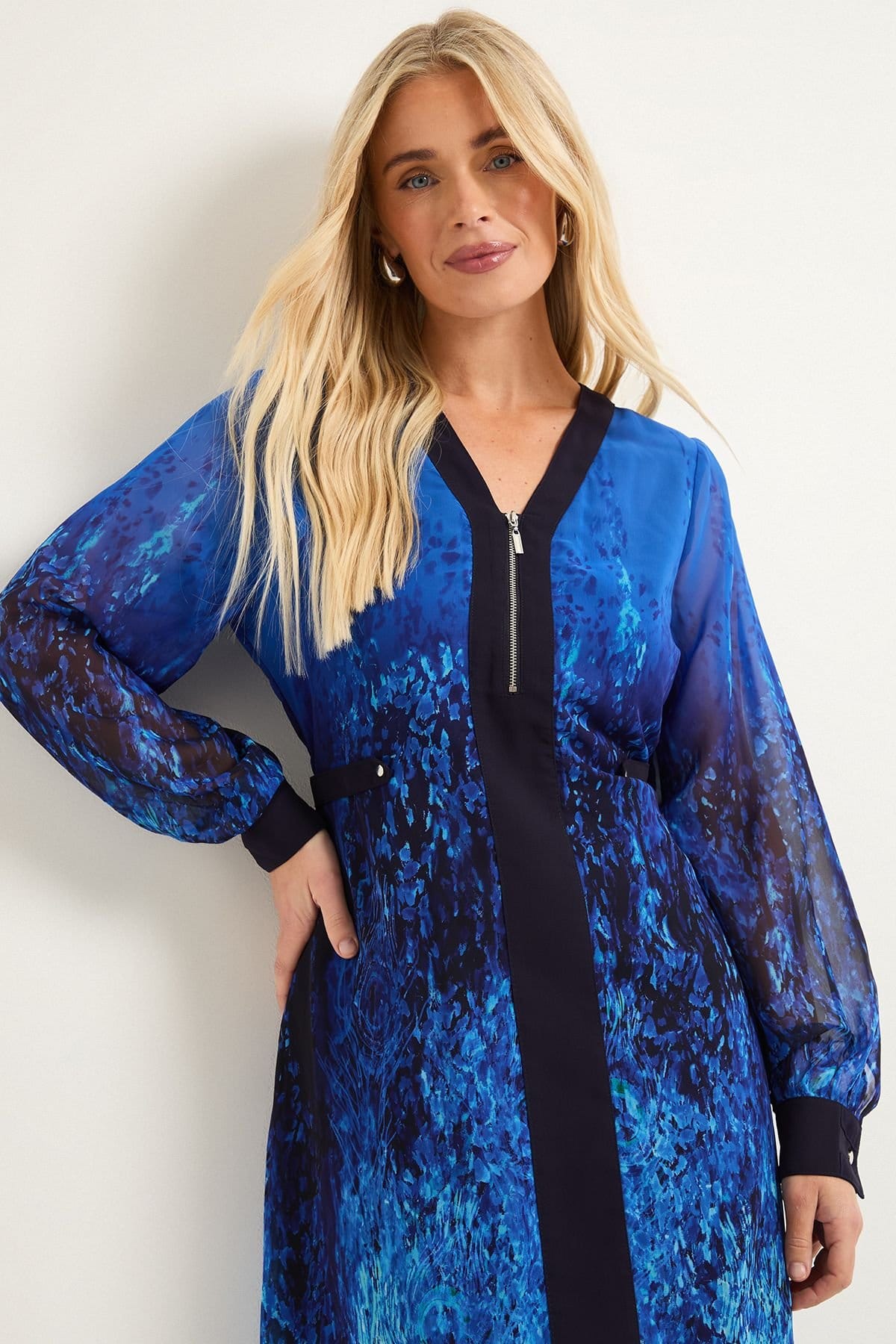 Striking ombre blue chiffon midi dress with eye-catching zip front detail. Elegant V-neckline with contrasting trim for a sophisticated finish. Flowing long sleeves with fitted cuffs for a graceful silhouette. Lightweight, floaty chiffon fabric that moves beautifully with you. Flattering midi length perfect for various occasions.
