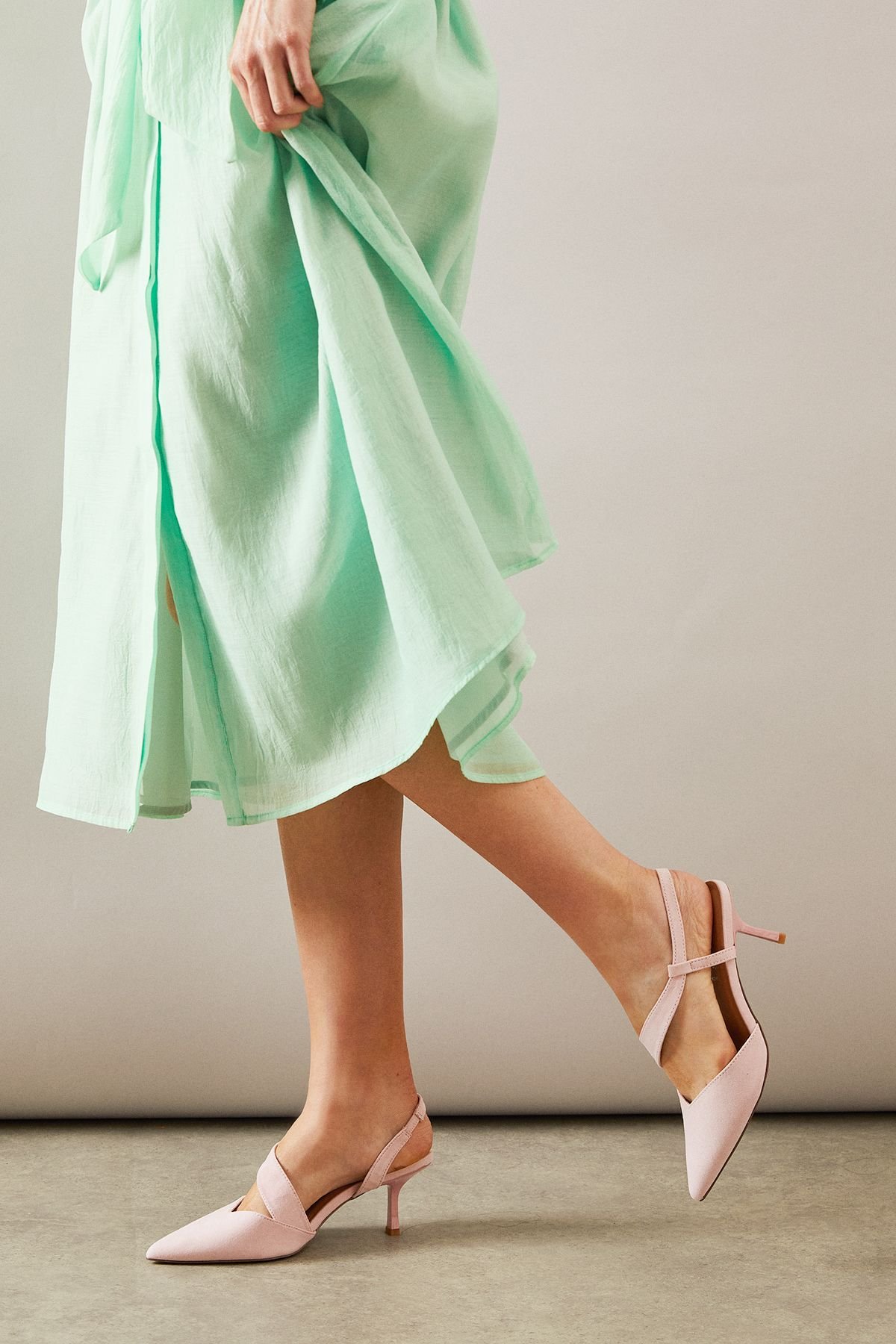 Modern asymmetric slingback design with a pointed toe silhouette. These kitten heels measure between 5 and 6.5cm, ensuring comfortable wear. The wide fit construction provides all-day comfort, making them versatile for both day and evening occasions.