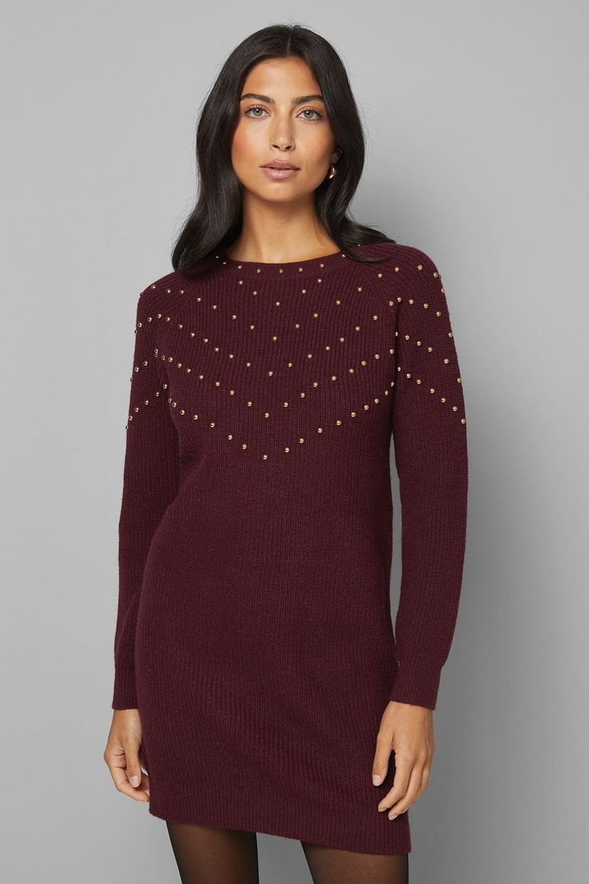 Festive burgundy knitted dress with stud embellishments for a touch of sparkle. Features a crew neckline and ribbed knit texture for warmth and structure. Perfect for the holiday season.