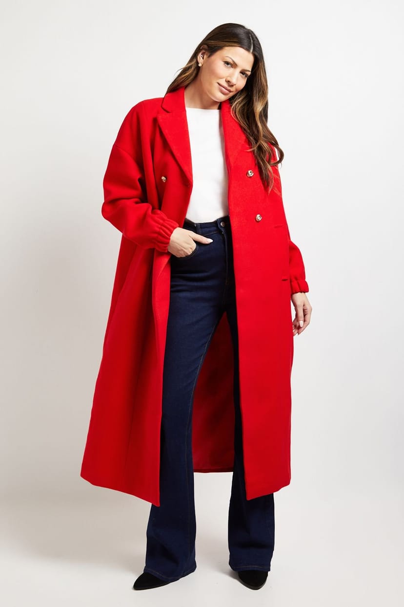 Striking double-breasted design with elegant button detailing. Oversized silhouette with contemporary drop shoulder cut. Practical side pockets for everyday essentials. Sophisticated collared neckline for a refined finish. Longline length offering maximum coverage and warmth.