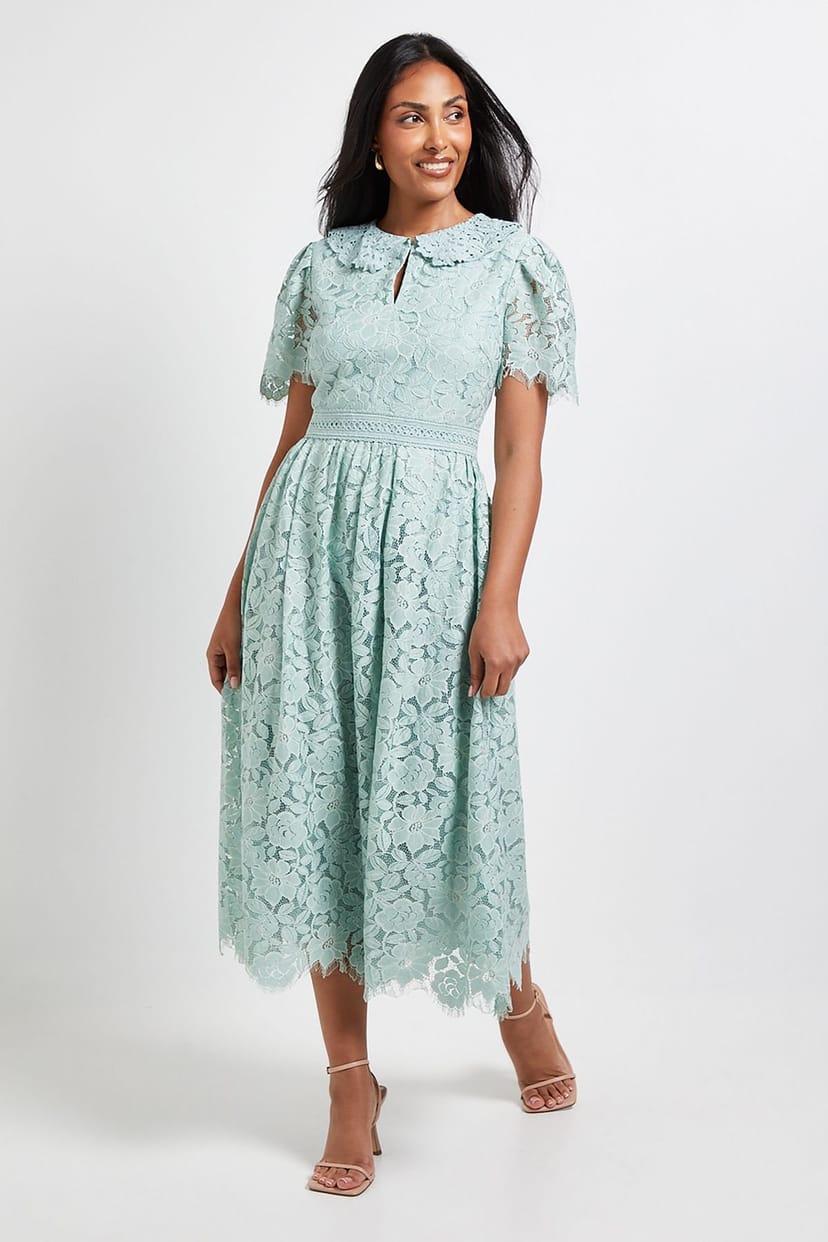 The Wallis Mint Lace Collared Button Midi Dress is available in sizes 10, 12, 14, 16, 18.