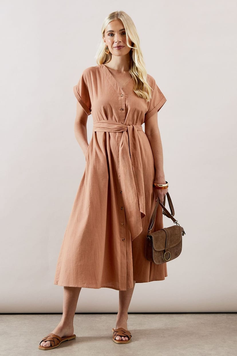 The Wallis Mocha Linen Mix Button Midi Dress is ideal for casual, everyday, date-night.