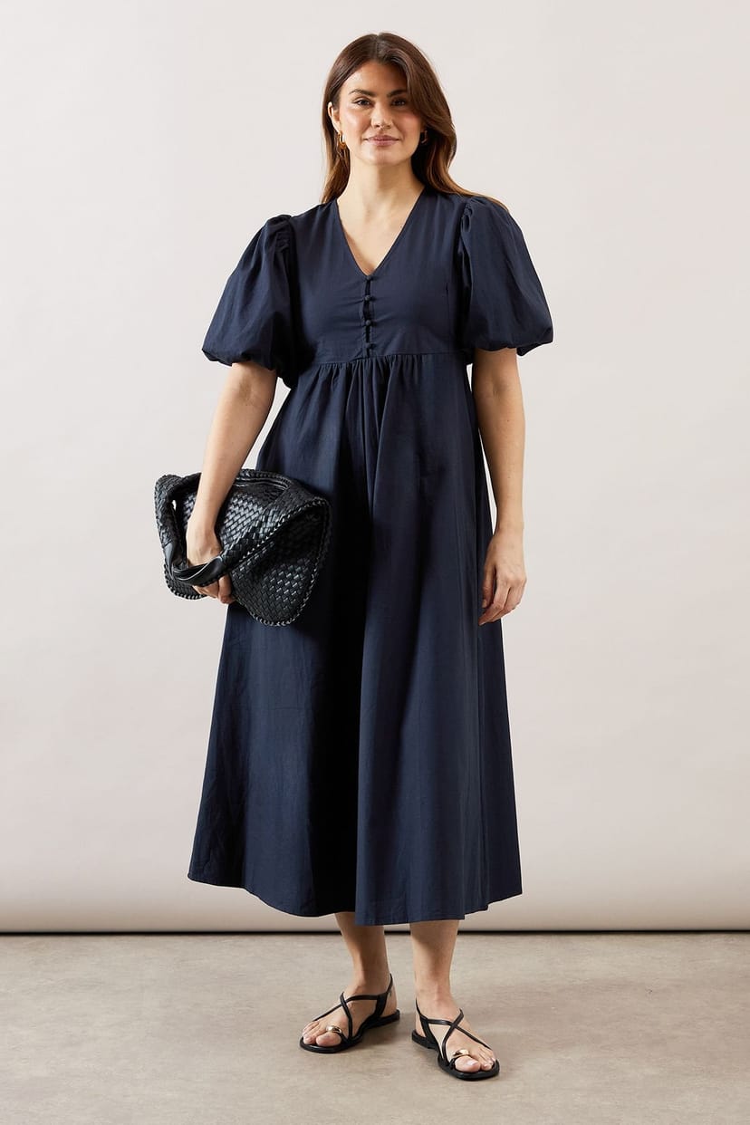 Sophisticated Navy cotton poplin midi dress with an elegant V-neckline and decorative button detail. Dramatic puff sleeves add a contemporary touch, while the empire waistline offers a flattering fit. Perfect for versatile styling options.