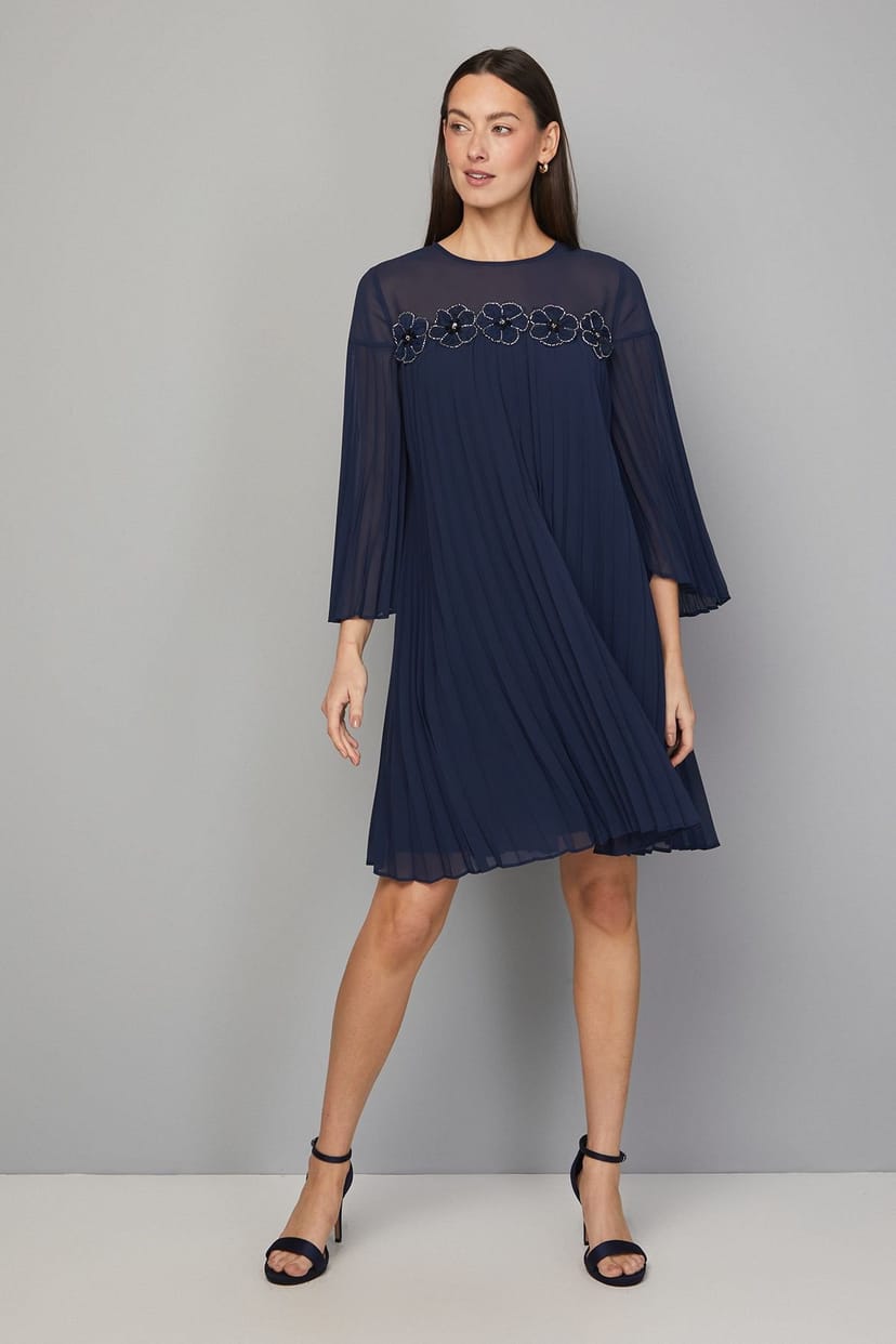 Sophisticated navy shift dress with delicate floral trim detailing across the bodice. The pleated design creates graceful movement with every step. Features a classic crew neckline and flowing three-quarter length sleeves.