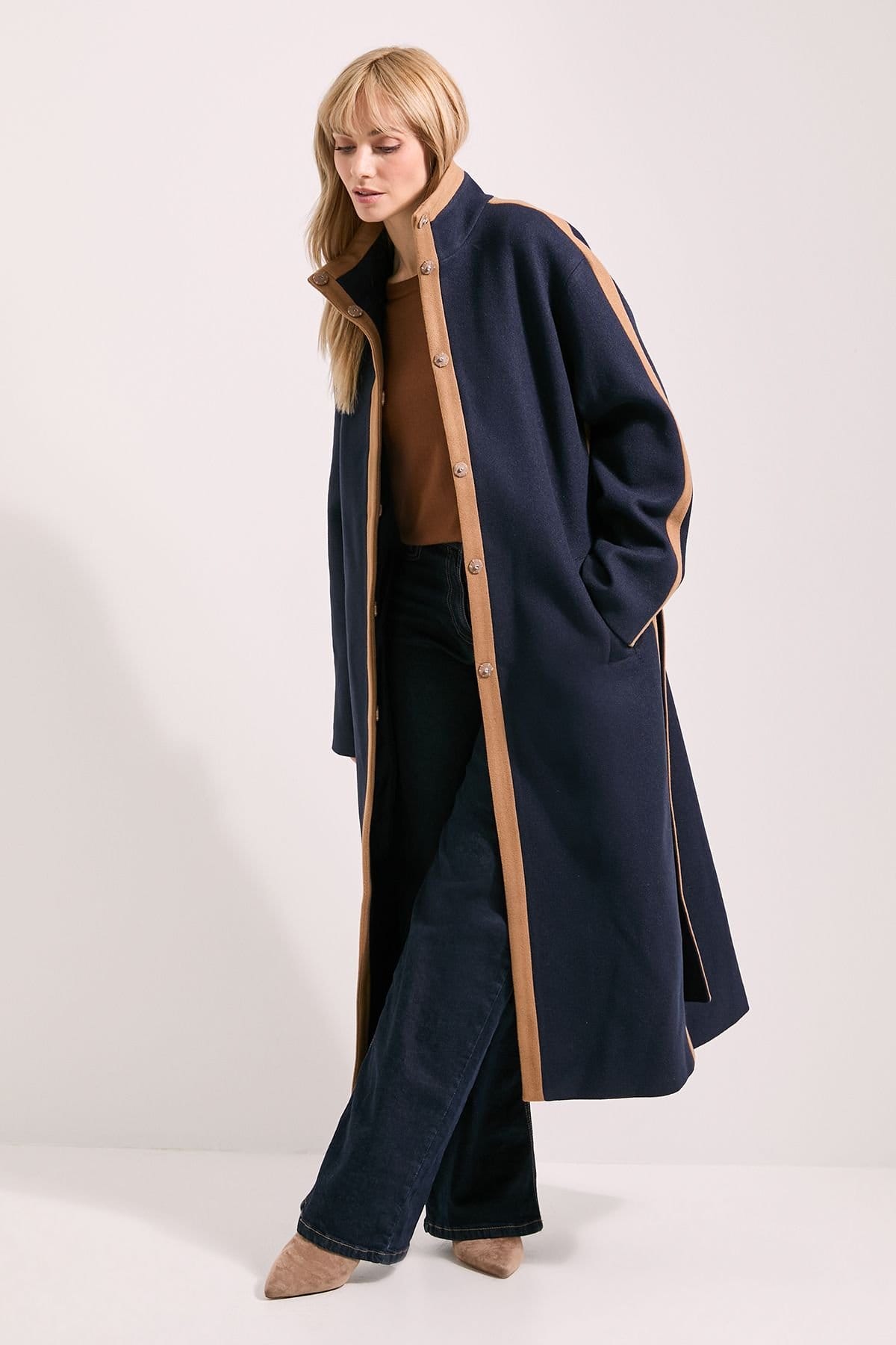 Sophisticated navy funnel coat with contrast piping along the front placket and edges. Features an elegant funnel neck design for extra warmth and a relaxed regular fit. Full-length for excellent coverage.