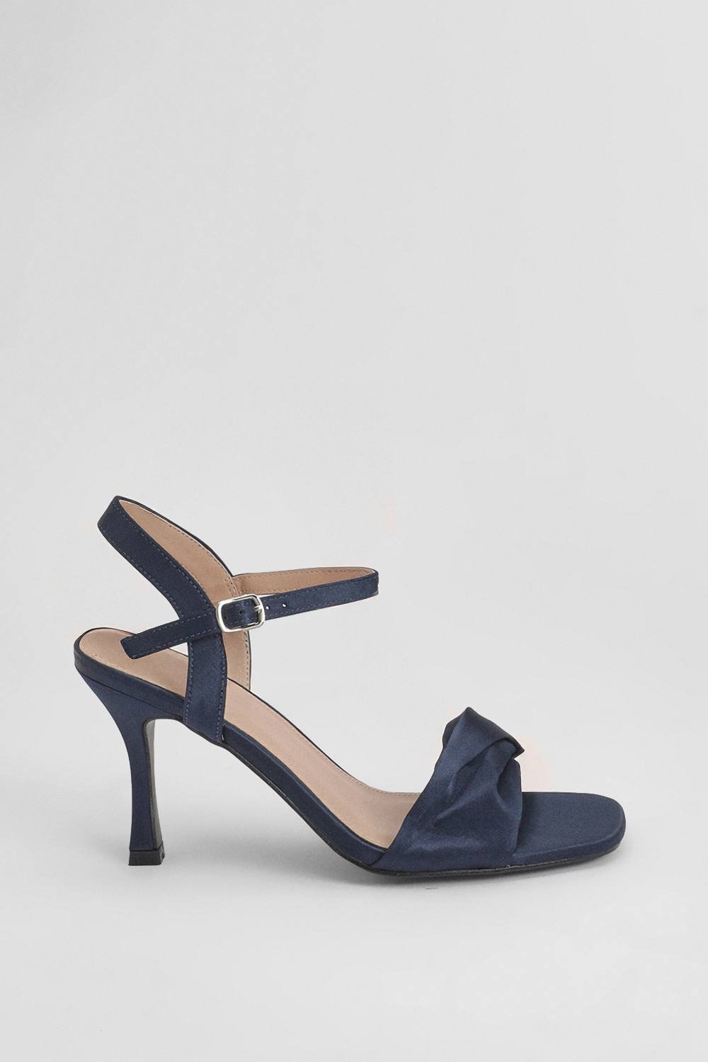 Chic Navy Satin high stiletto heel sandals featuring a soft twist front and wide fit design. Perfect for evening events or formal occasions.