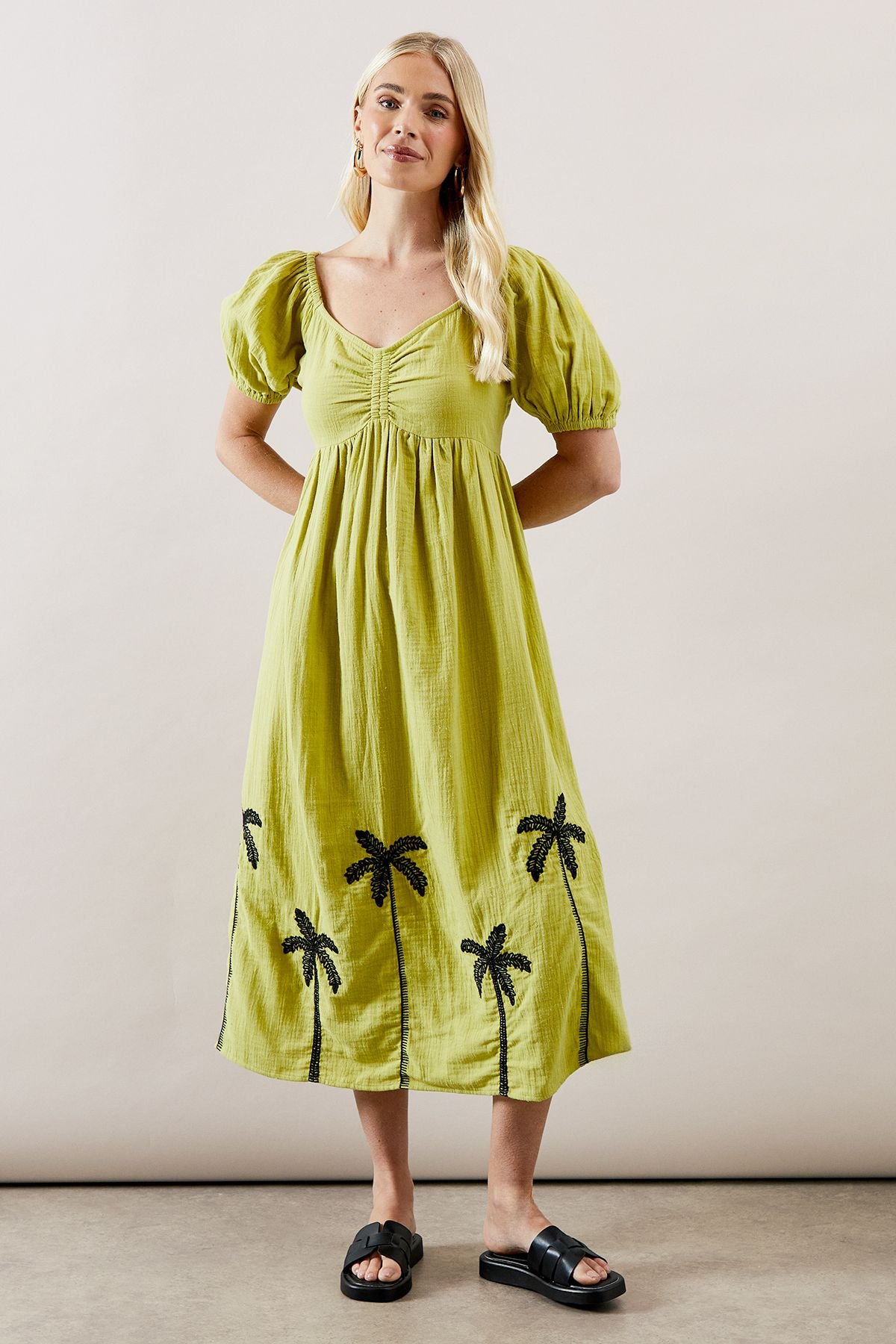 Charming textured cotton midi dress in olive with eye-catching palm tree embroidery along the hemline. Features a sweetheart neckline with gathered detail and puff sleeves with elasticated cuffs for a vintage-inspired touch. The empire waistline ensures a comfortable, relaxed fit.