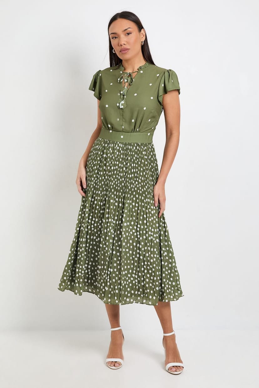 The Wallis Olive Polka Dot Midi Dress with Ruffle Neck is ideal for evening, date-night, party.