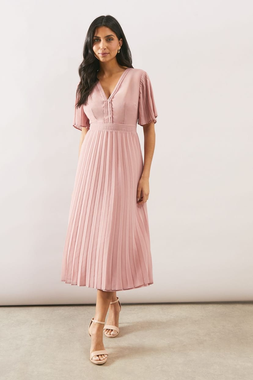 The Wallis Rose Chiffon Pleated Sleeve Midi Dress is available in sizes 12, 14, 16, 18.