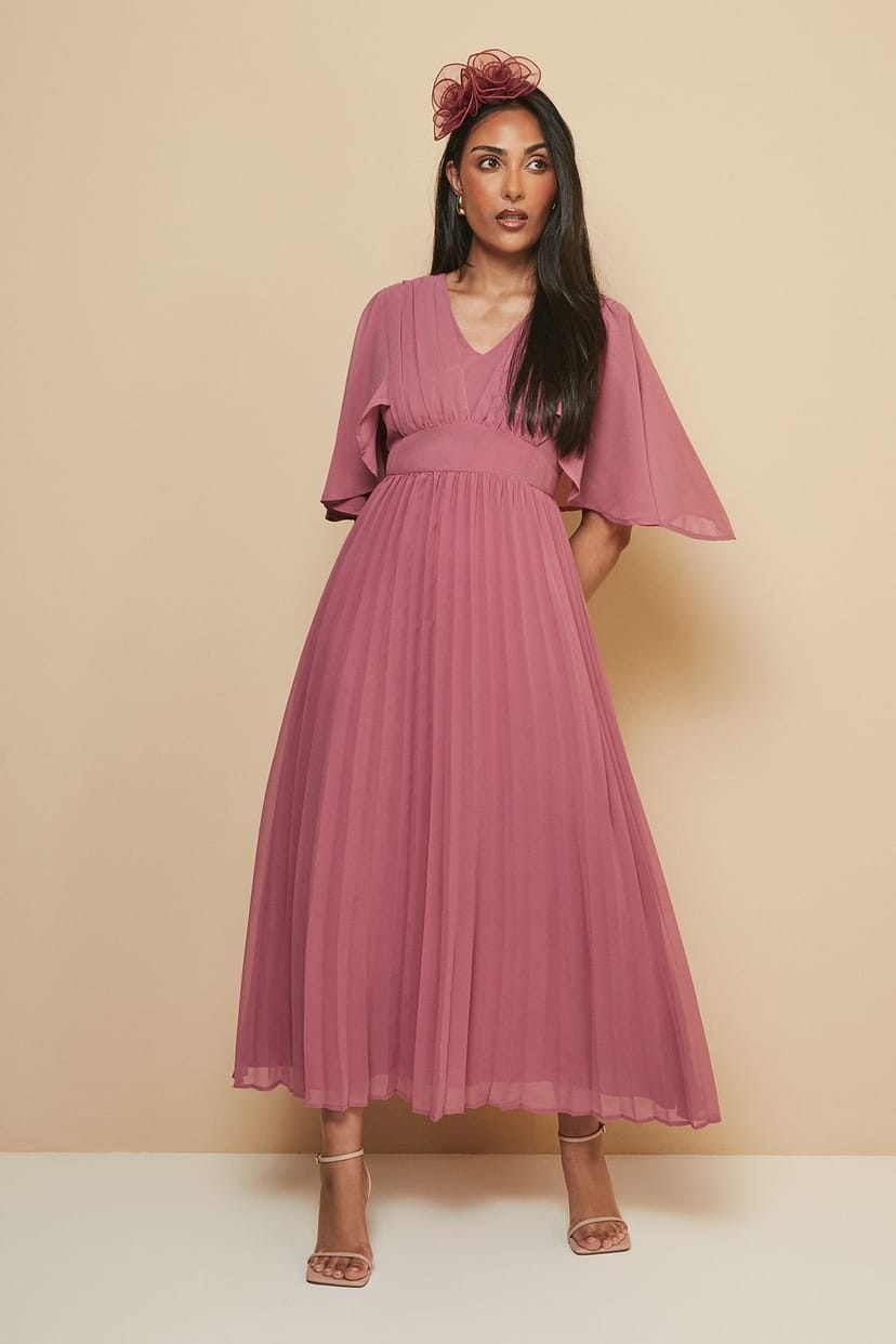 View Debenhams's returns policyElegant rose midi dress with a V-neckline and cape sleeves. Features delicate pleating throughout the skirt for beautiful movement. Empire waistline enhances your natural shape. Fully lined for comfort and a smooth drape. Designed for a petite fit.