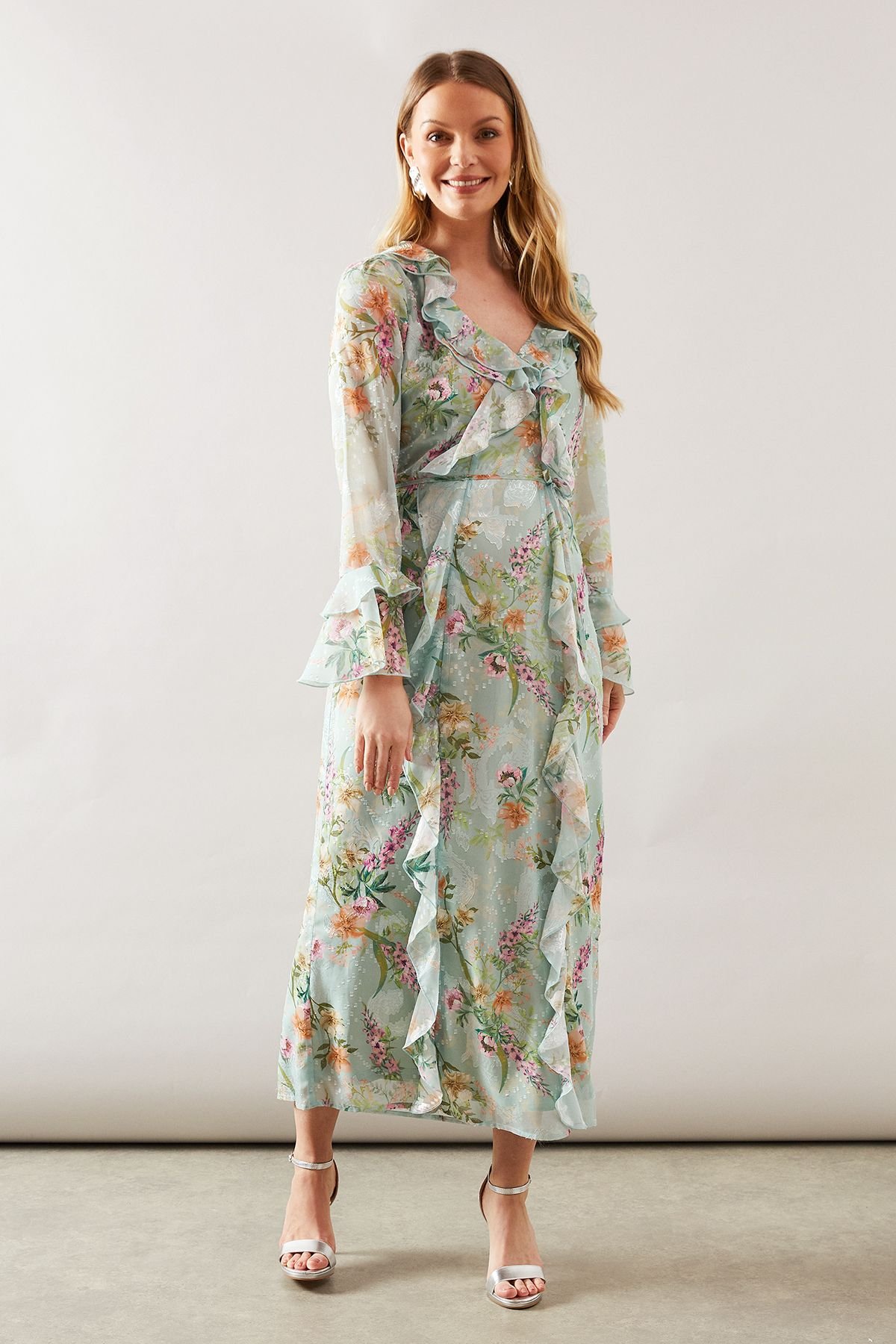 The Wallis Sage Floral Ruffle Belted Midaxi Dress is ideal for evening, date-night, party.