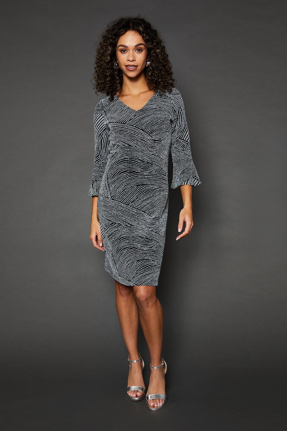 Alluring silver glitter jersey fabric for a dazzling effect. Flattering shift silhouette with ruffle detailing. Elegant V-neckline for a feminine touch. Three-quarter length sleeves with eye-catching bell cuffs. Versatile knee-length design suitable for various occasions.