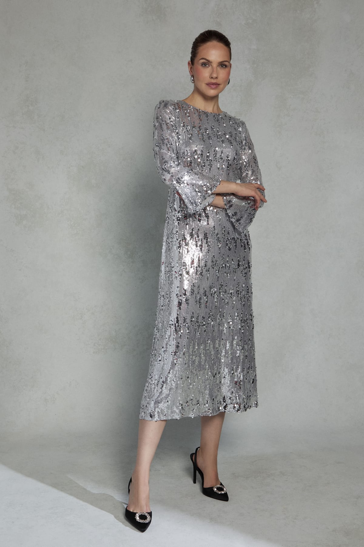 The Wallis Silver Sequin Midi Dress with Flared Sleeves is ideal for evening, party, date-night.