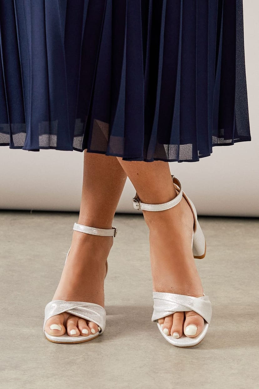 Chic silver faux leather low block heel sandals from Wallis. Featuring a soft twist design and wide fit for added comfort. Ideal for elevating any outfit.