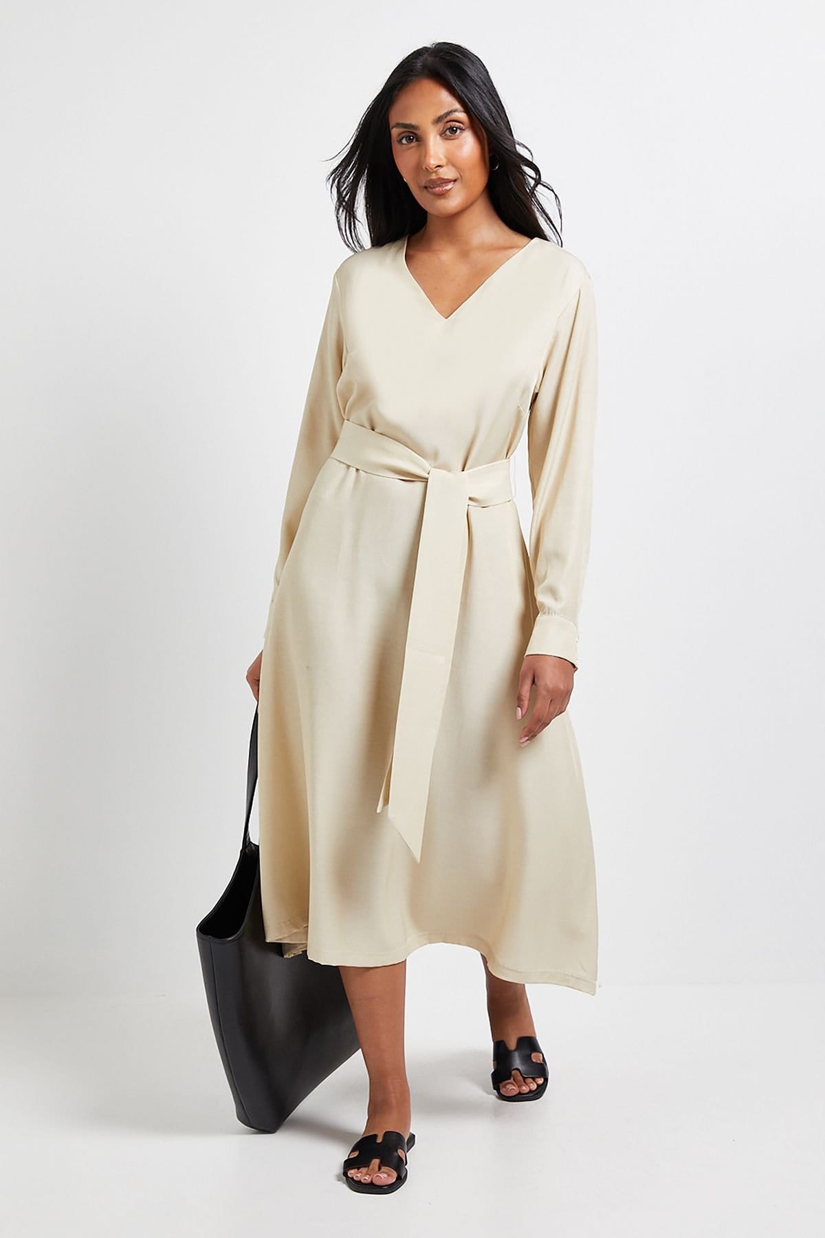 Sophisticated midi dress in stone featuring a flattering V-neckline and tie waist detail. The flowing fabric provides elegant coverage, perfect for versatile styling. Long sleeves add a touch of refinement to this casual piece.