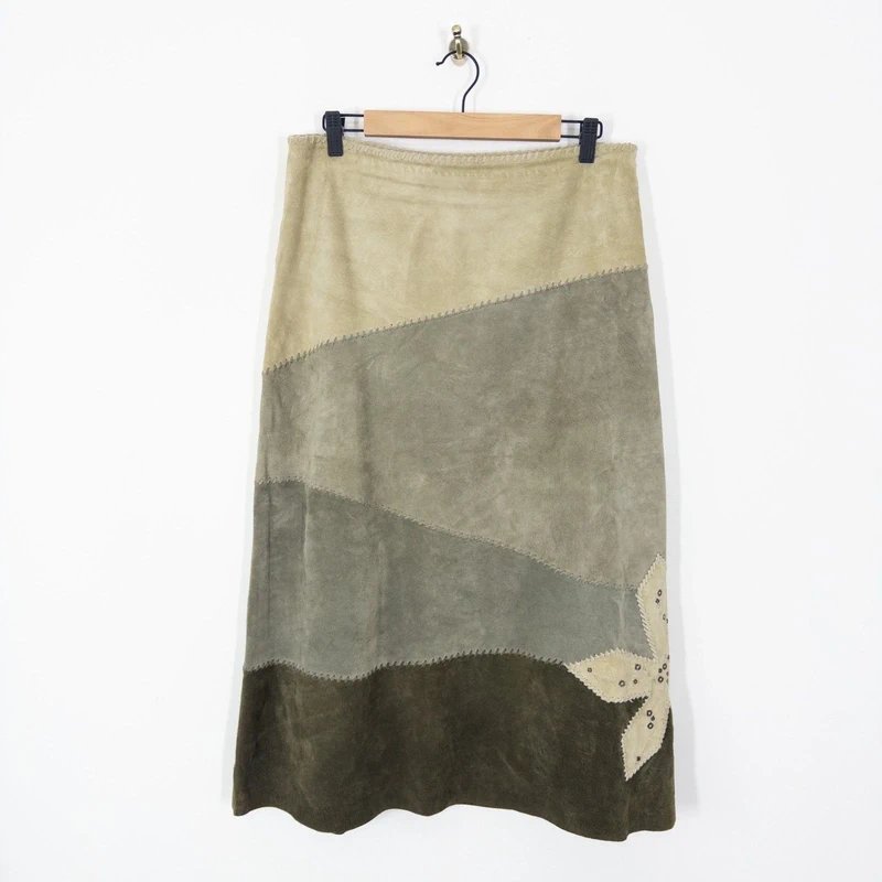 Beige and Khaki Patchwork Midi Skirt — the must-have bohemian piece for any wardrobe. Designed in vintage beige and khaki, this patchwork midi skirt features suede leather with blanket/whipstitch detailing and a zip side closure. Perfect for adding a touch of y2k flair to any outfit. Includes a lined interior for comfort and coverage.