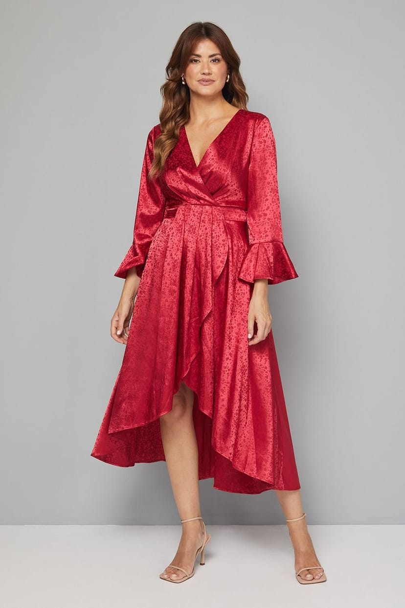 The Wallis Wine Satin Jacquard Wrap Ruffle Dress is ideal for evening, date-night, party.