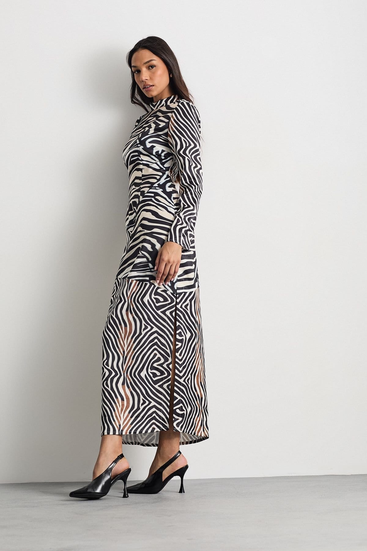 Striking zebra print satin maxi dress with contrasting panelled design. Elegant crew neckline and long sleeves for sophisticated coverage. Luxurious satin finish that catches the light beautifully. Flattering maxi length with side slit for ease of movement.