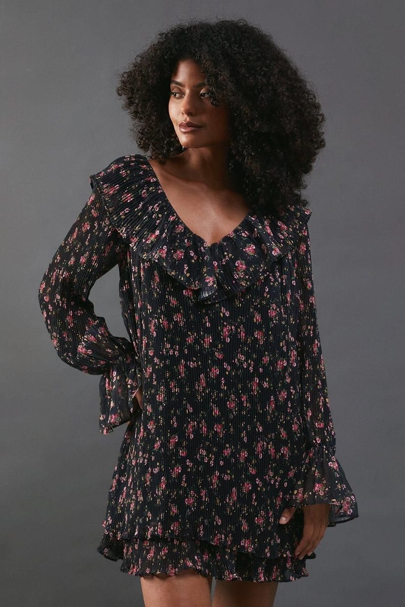The Warehouse Black Floral Pleated Chiffon Mini Swing Dress is made from chiffon.