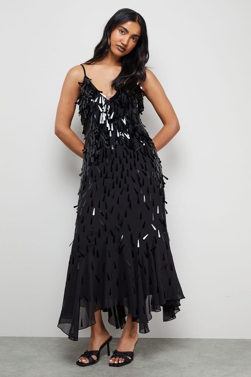 The Warehouse Black Teardrop Embellished Midi Dress is ideal for evening, date-night, party.