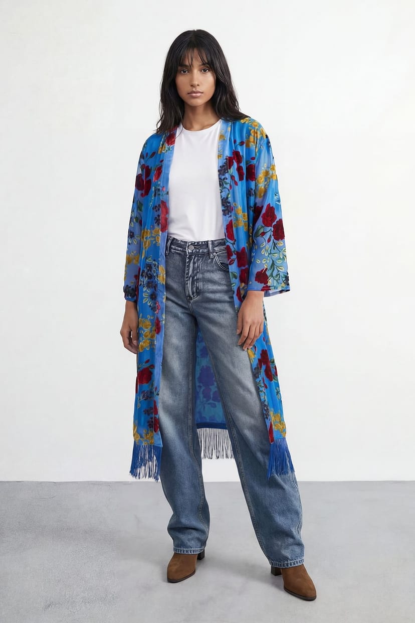 Striking burnout fabric with a bold floral pattern creates a statement piece for your wardrobe. Midi-length kimono design offers versatile layering options for multiple seasons. Fringe hem detail adds movement and texture to this sophisticated piece.