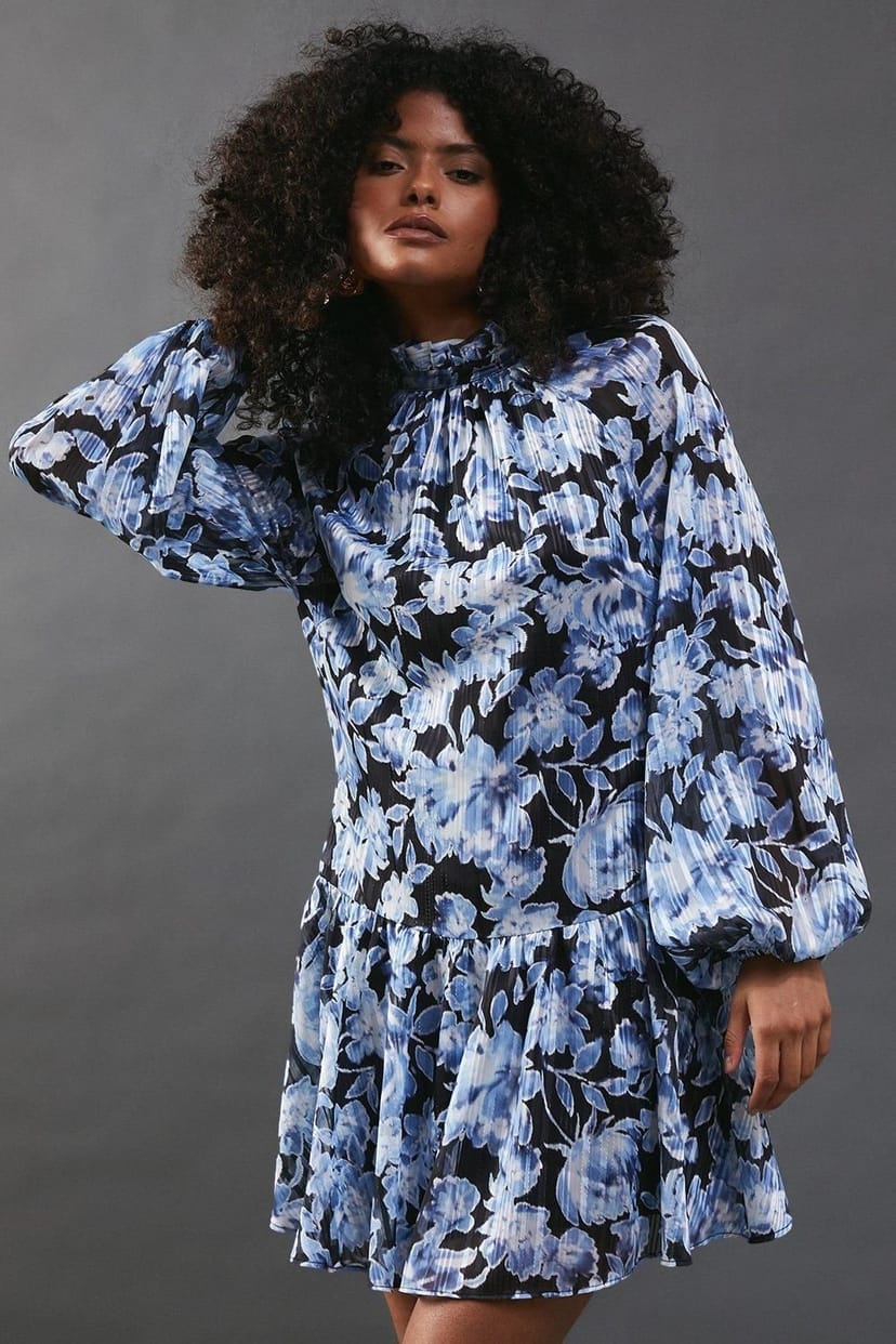 The Warehouse Blue Floral High Neck Tie Back Mini Dress is available in sizes 10, 12, 8.