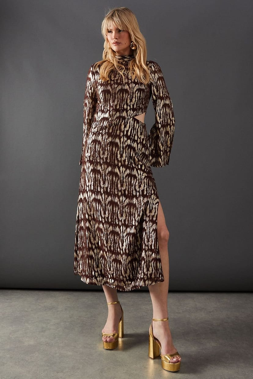 Striking animal-inspired metallic jacquard pattern. Elegant midi length for versatile styling. Alluring side cut-out detail for a modern twist. Long sleeves with subtle flare for added drama. High neckline balances the bold design.