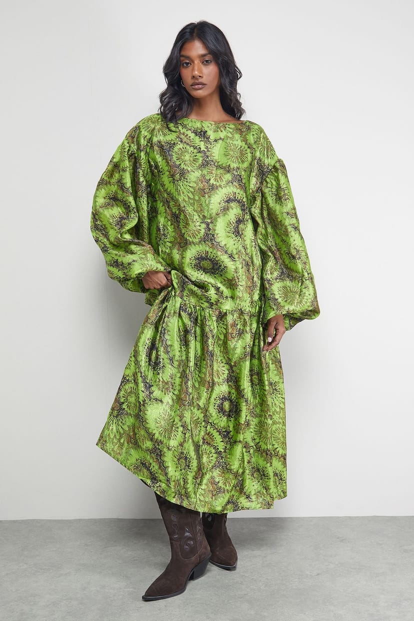 Striking floral textured organza midi dress with dramatic volume sleeves. The asymmetric seam adds a contemporary touch. Perfect for evening events or date nights.
