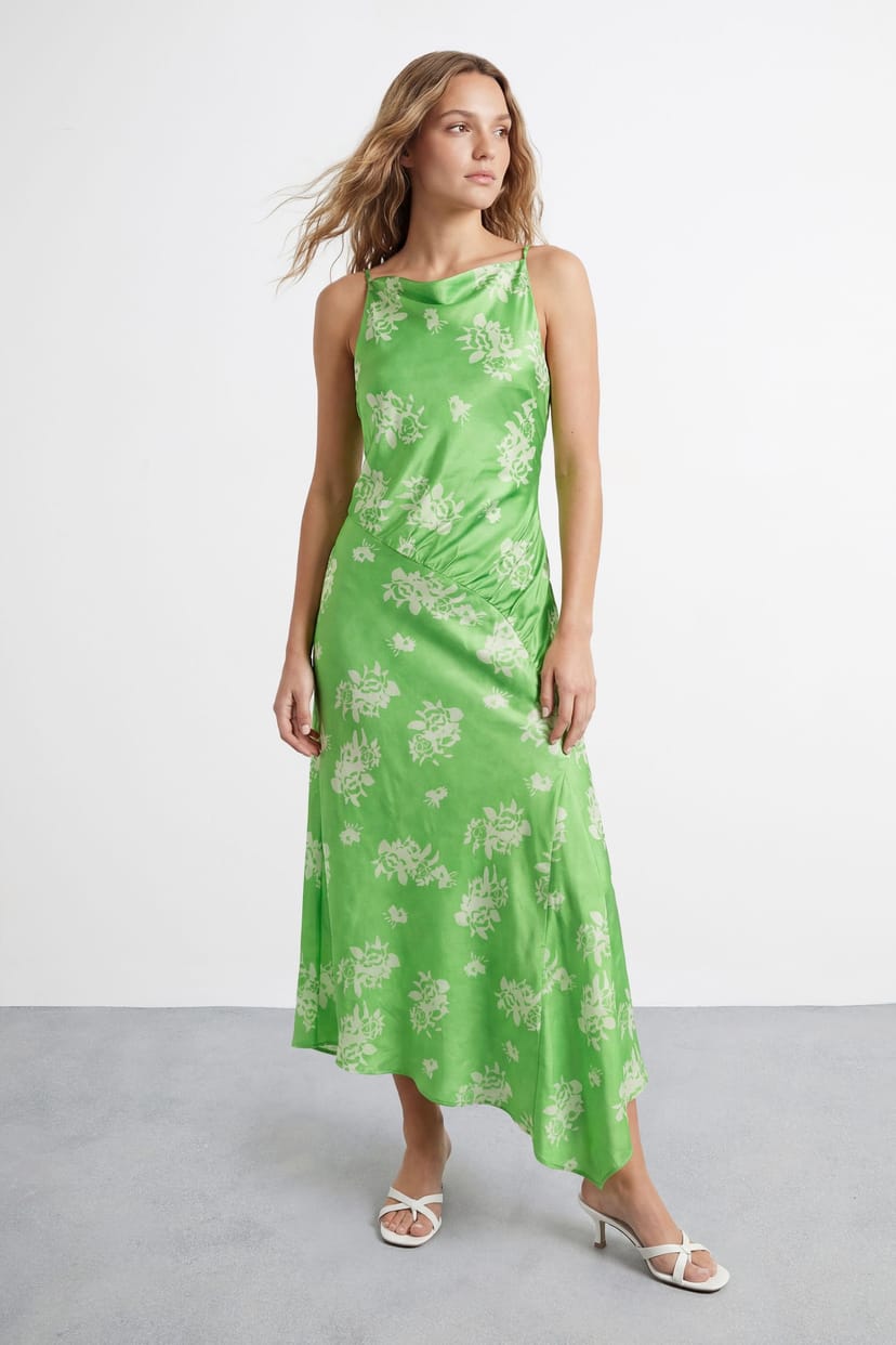 Sophisticated green floral satin dress with a racer neck and delicate seam detailing. The bias cut drapes effortlessly, creating a flattering silhouette. Perfect for evening events or special occasions.