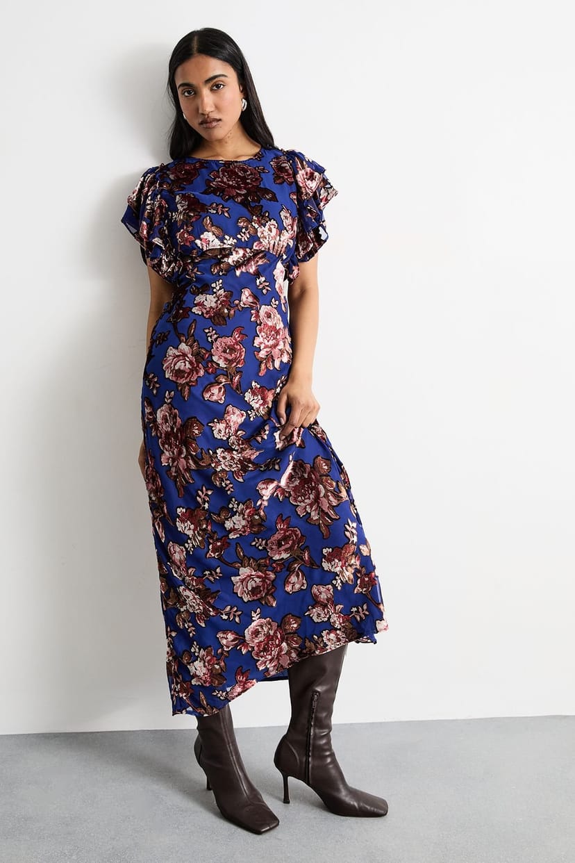 Luxuriant devore fabric with textured floral pattern that catches the light beautifully. Elegant ruffle sleeves add movement and feminine detailing. Sophisticated round neckline balances the statement sleeves perfectly. Flattering cinched waist design creates a defined silhouette. Flowing maxi length for a dramatic finish.
