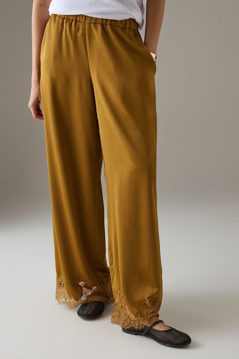 The Warehouse Ochre Satin Lace Trousers for Women is made from satin, lace.