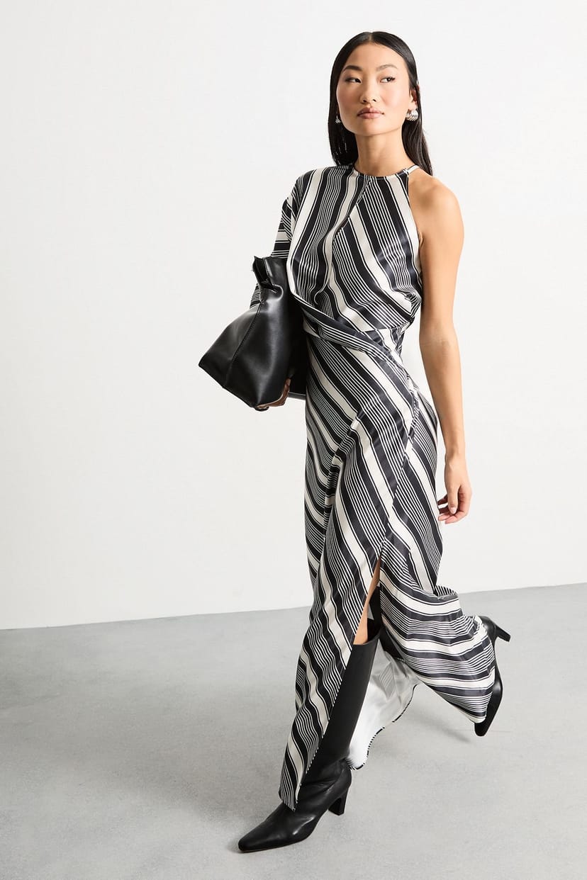 The Warehouse Black & White Satin Maxi Dress with Twist Front is ideal for evening, date-night, party.
