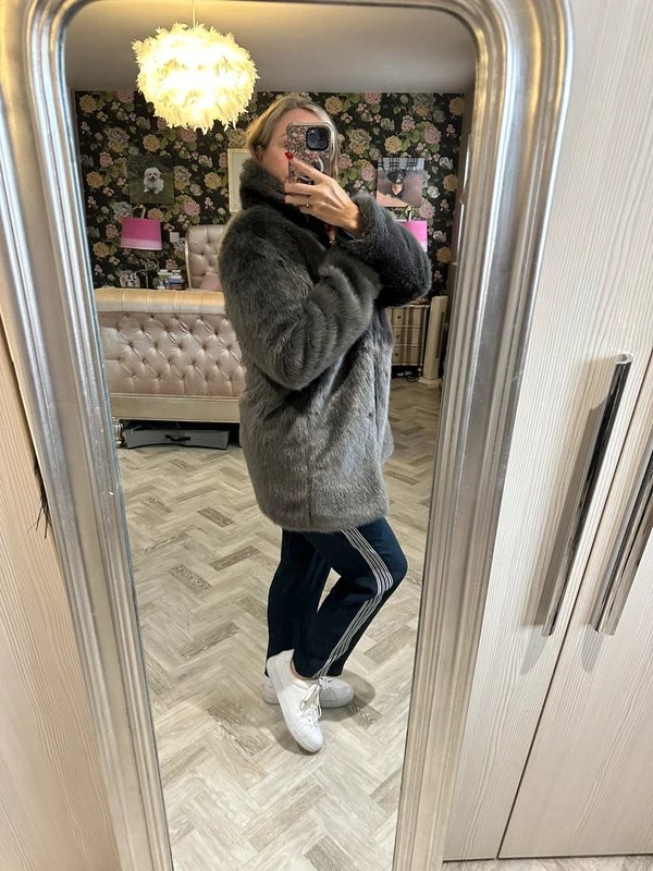 The Warehouse Faux Fur Coat in Grey is available in sizes M.