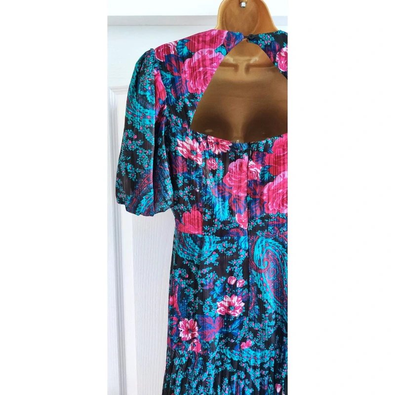 The Warehouse Floral Pleated Long Dress in Pink/Teal is available in sizes S.