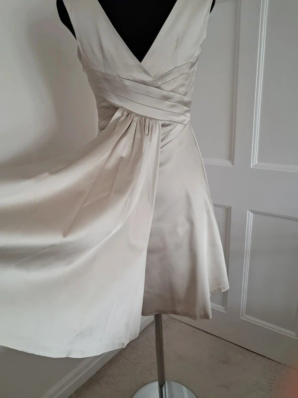 Beige V-neck short satin dress by Warehouse. Features pleat details on the front and back, a short train detail at the back of the skirt, and a tulle petticoat lining. The dress has a side zip closure and is fully lined for comfort. Perfect for special occasions.