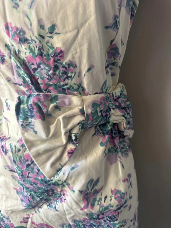 The Warehouse Sleeveless Floral Print Dress with Waist Bow Detail is available in sizes S.