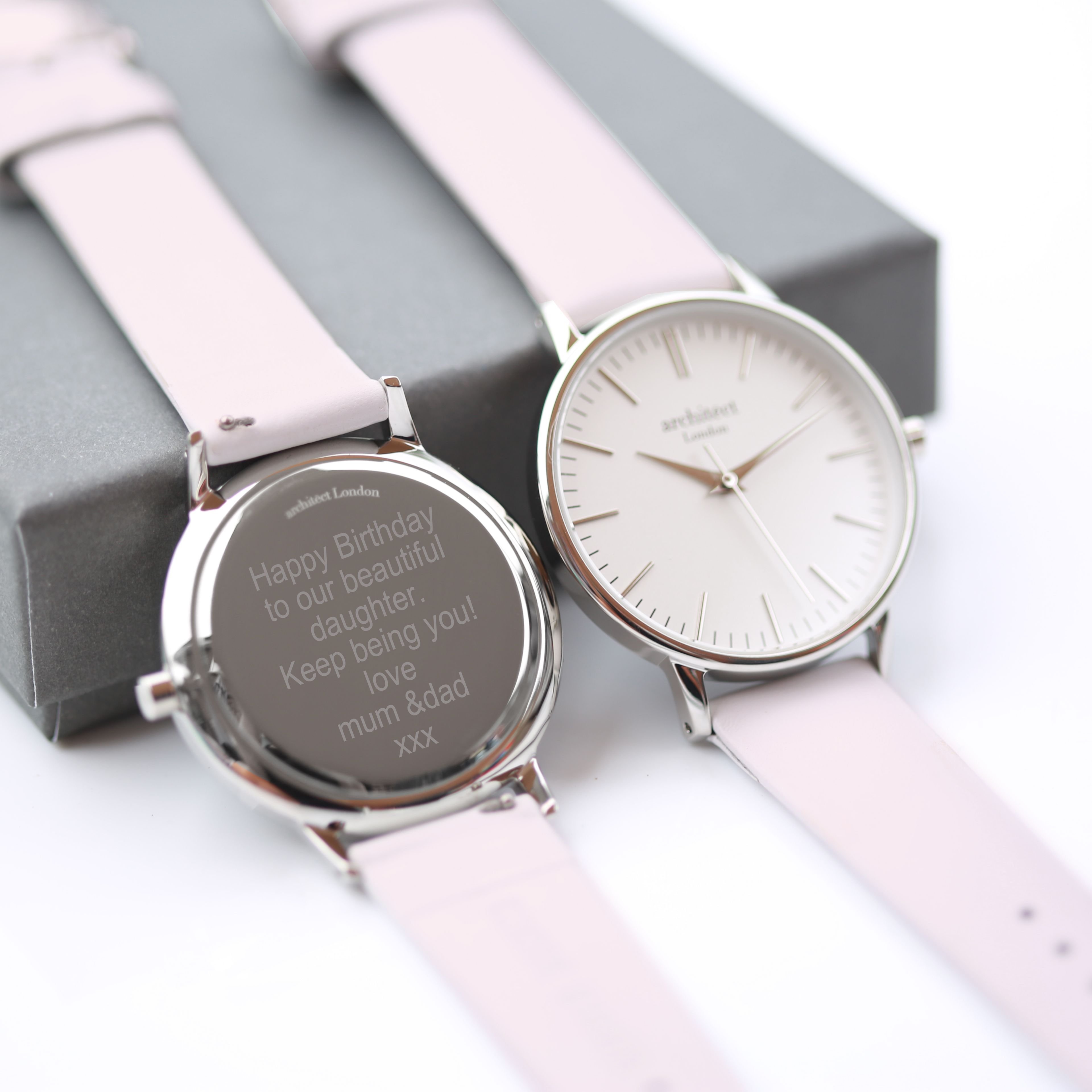 A personalised watch for women with a minimalist design and a pale pink strap. The silver bezel adds a touch of elegance, making it perfect for everyday wear or special occasions.
