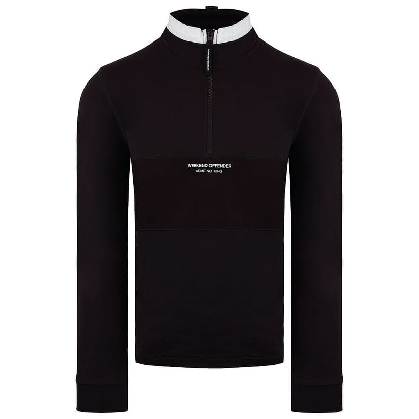 Stylish Weekend Offender long-sleeve men's sweater in dark chocolate brown. Made from a soft cotton blend, this sweater features a zippered front and a contrasting white collar. Ideal for casual and smart-casual looks.