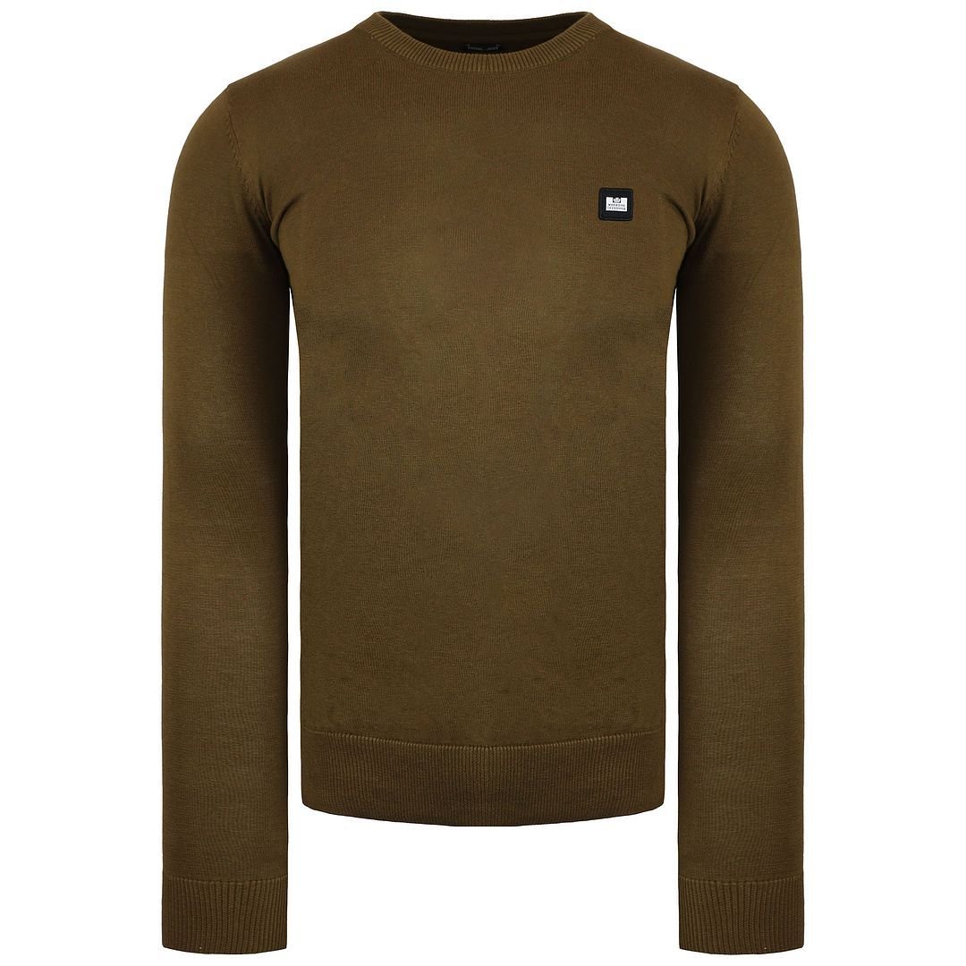 Stylish olive crew neck sweater by Weekend Offender. Made from soft cotton, it features a classic fit and a subtle brand logo on the left chest.
