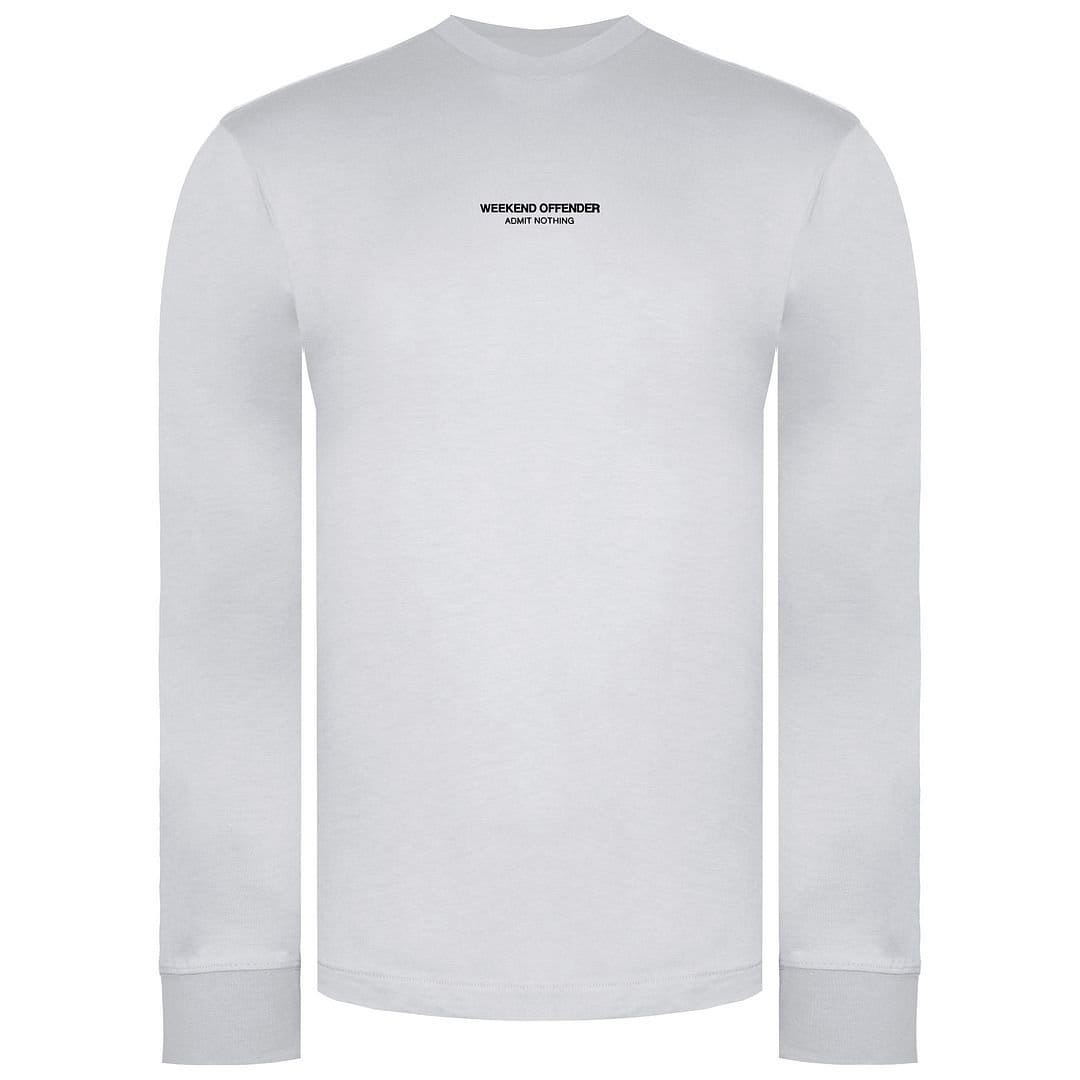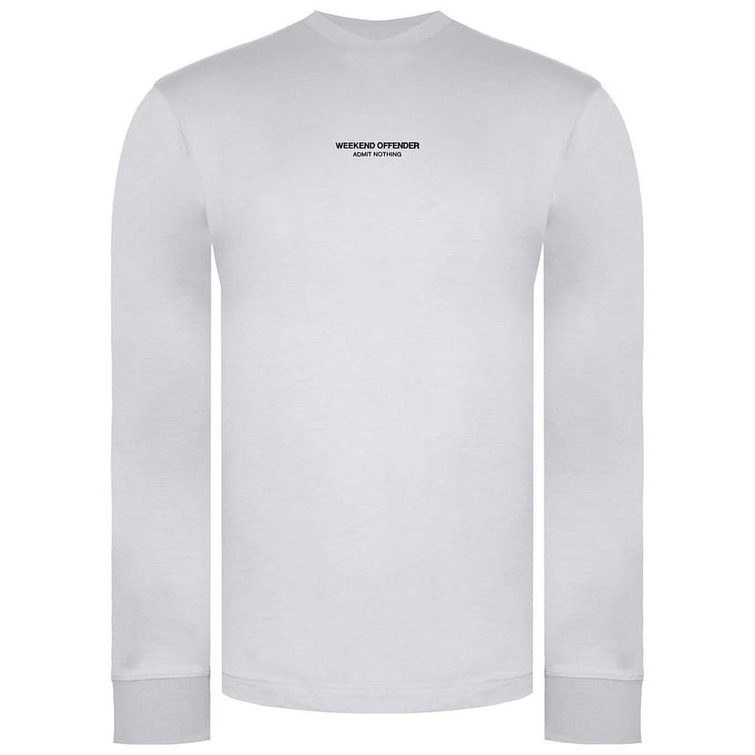 Sleek white crew neck long sleeve top by Weekend Offender. Made from soft cotton, it features a minimalist design with a bold statement on the back. Ideal for casual wear.
