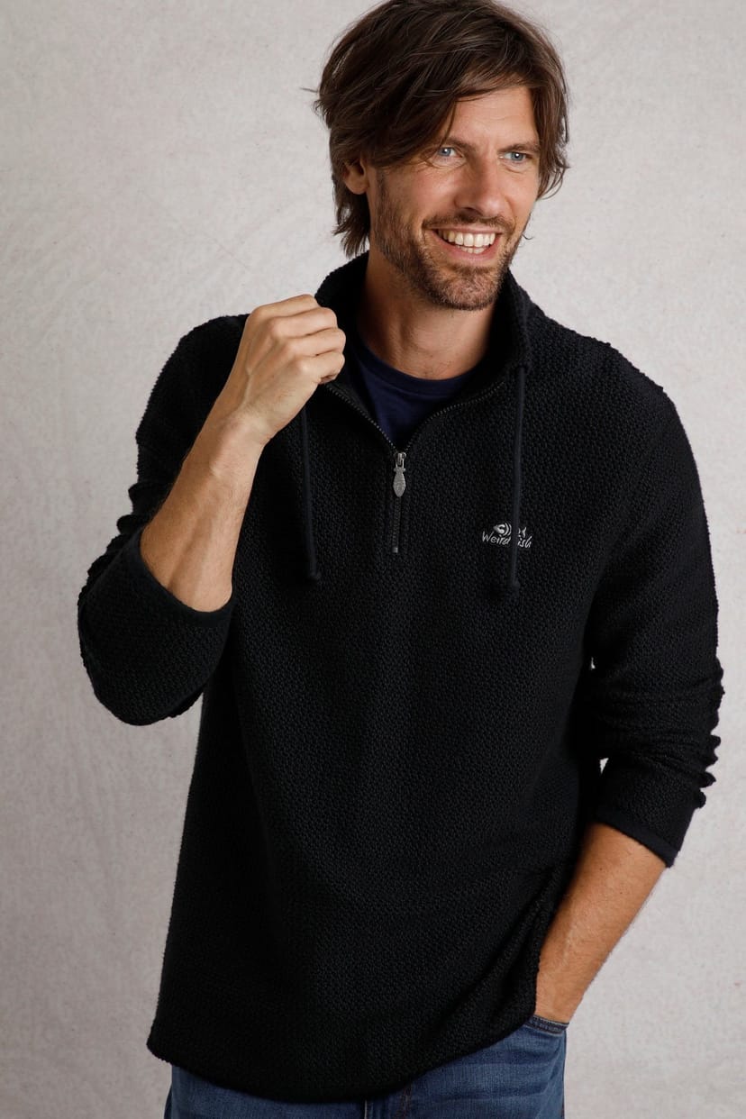 Iconic Weird Fish sweatshirt in black. Featuring a semicircle texture and a 1/4 zip for a casual yet stylish look. Perfect for everyday wear.