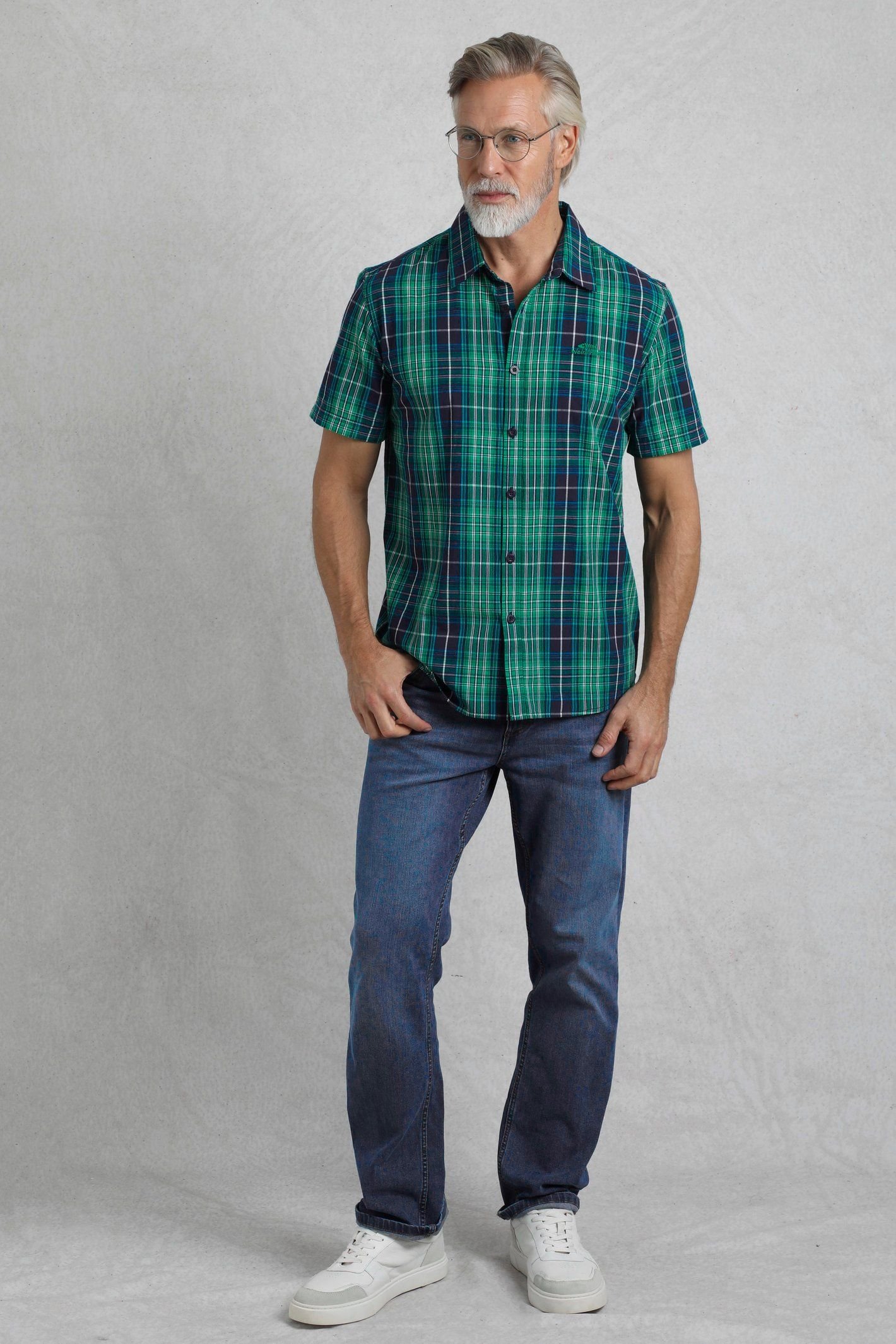 Stylish short sleeve check shirt in dark blue and green. Made from lightweight cotton, it offers breathability and comfort. Ideal for casual outings or layering.
