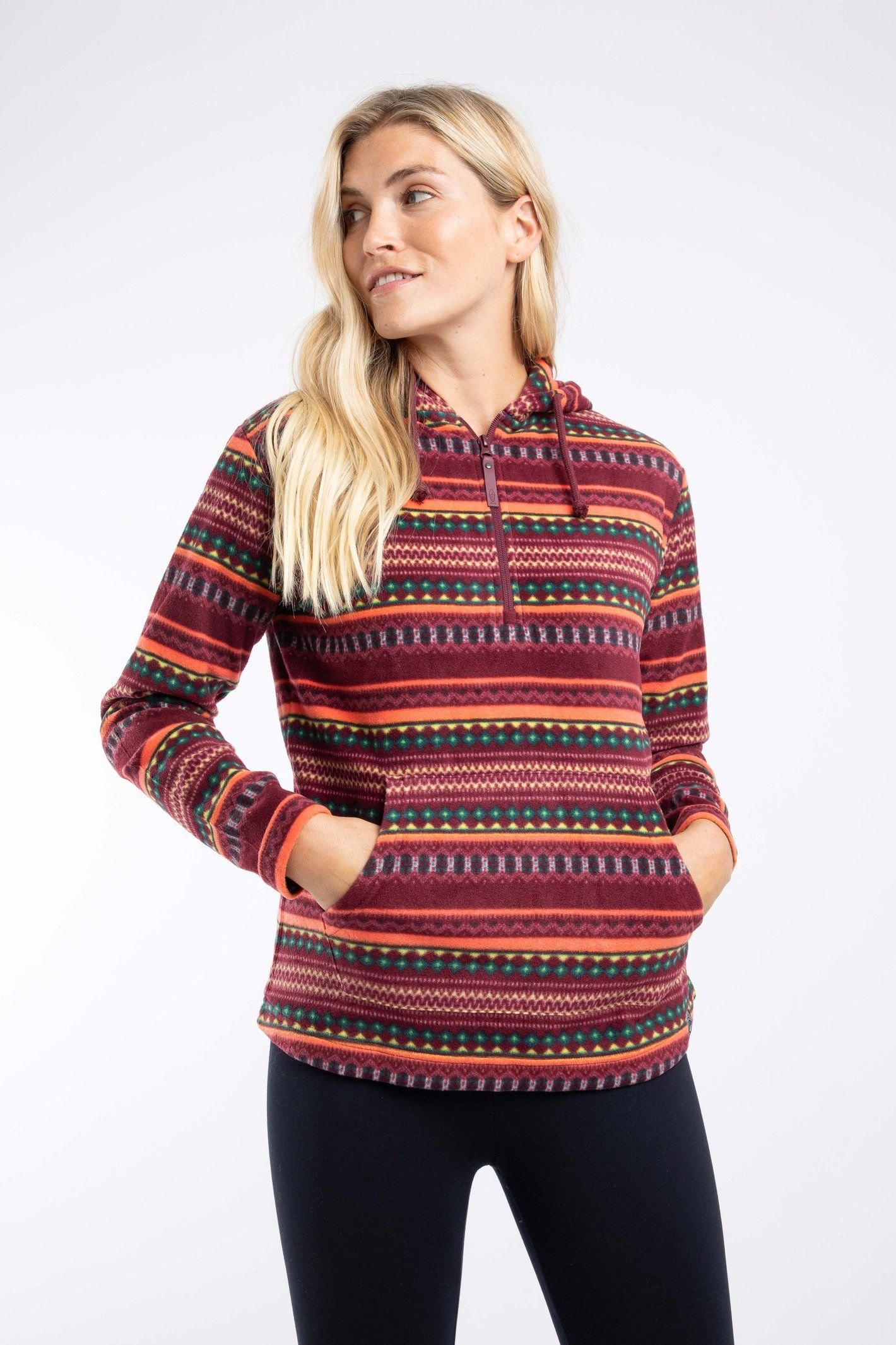Vibrant maroon microfleece hoodie with a quarter zip and a hooded neckline. Features a patterned design with a mix of maroon, orange, and green hues. Ideal for transitional seasons and casual wear.