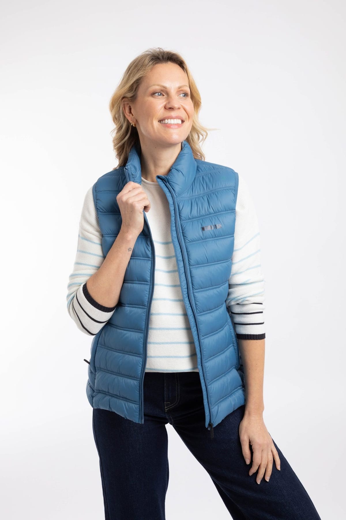 Stylish mid blue gilet by Weird Fish with a lightweight padded design. Ideal for layering over a fleece during transitional seasons. Features silicone branding and trims, and a colour contrast lining.